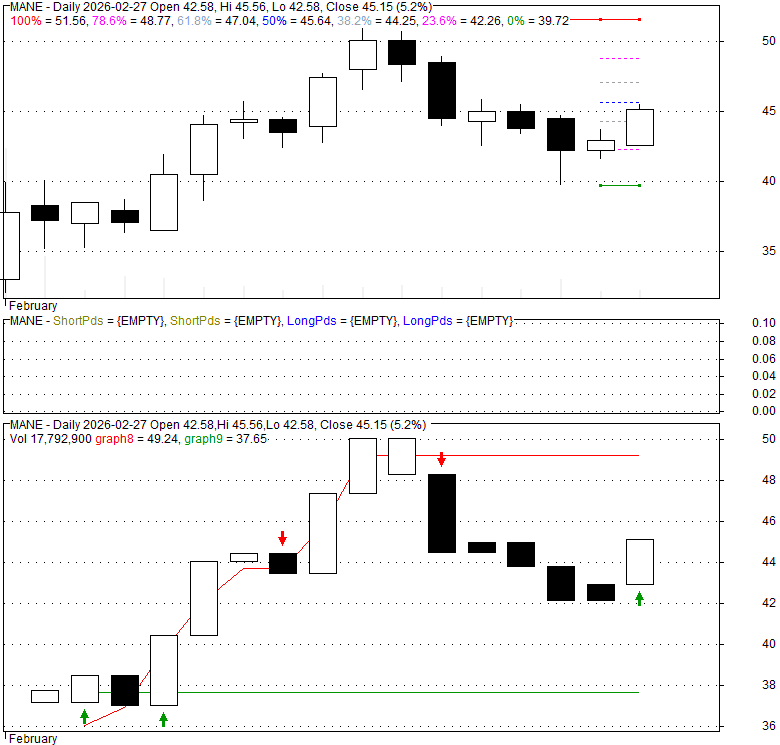 Price has closed above its short-term moving average. Short-term moving average is currently below mid-term; and below long-term moving average. From the relationship between price and moving averages: This stock is NEUTRAL in short-term; and NEUTRAL in mid-long term.[ MANE ] has closed below upper band by 39.9%. Bollinger Bands are 0% narrower than normal.