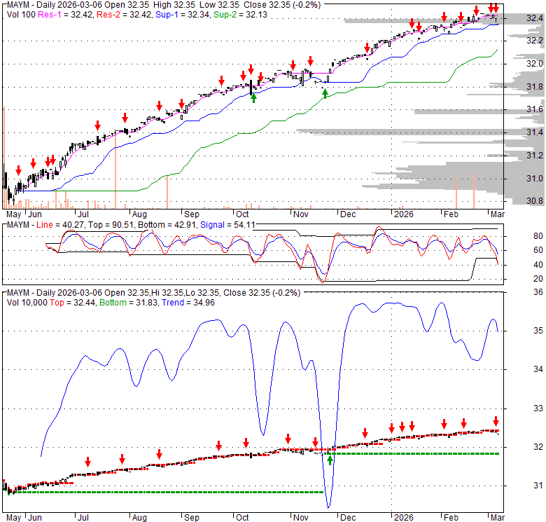 Price has closed below its short-term moving average. Short-term moving average is currently above mid-term; and above long-term moving average. From the relationship between price and moving averages: This stock is NEUTRAL in short-term; and BULLISH in mid-long term.[ MAYM ] has closed above bottom band by 14.2%. Bollinger Bands are 23.6% narrower than normal. The current width of the bands does not suggest anything about the future direction or movement of prices.
