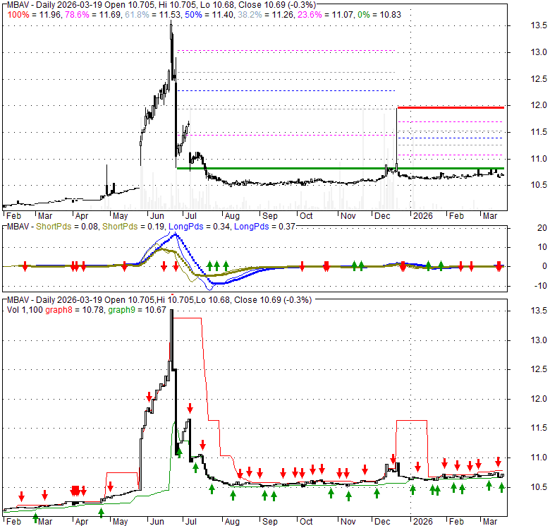 Price has closed below its short-term moving average. Short-term moving average is currently above mid-term; and above long-term moving average. From the relationship between price and moving averages: This stock is NEUTRAL in short-term; and BULLISH in mid-long term.[ MBAV ] has closed above bottom band by 35.4%. Bollinger Bands are 26.3% narrower than normal. The current width of the bands does not suggest anything about the future direction or movement of prices.