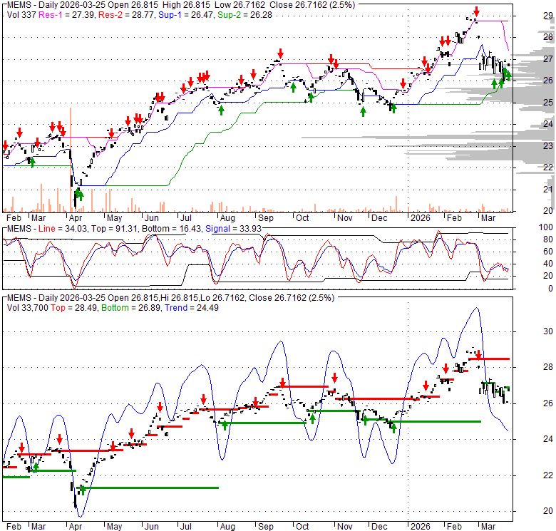 Price has closed above its short-term moving average. Short-term moving average is currently below mid-term; and above long-term moving average. From the relationship between price and moving averages: This stock is NEUTRAL in short-term; and NEUTRAL in mid-long term.[ MEMS ] has closed above bottom band by 46.6%. Bollinger Bands are 17.7% narrower than normal. The current width of the bands does not suggest anything about the future direction or movement of prices.