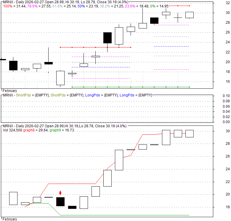 Price has closed above its short-term moving average. Short-term moving average is currently below mid-term; and below long-term moving average. From the relationship between price and moving averages: This stock is NEUTRAL in short-term; and NEUTRAL in mid-long term.[ MRNX ] has closed below upper band by 15.5%. Bollinger Bands are 0% narrower than normal.
