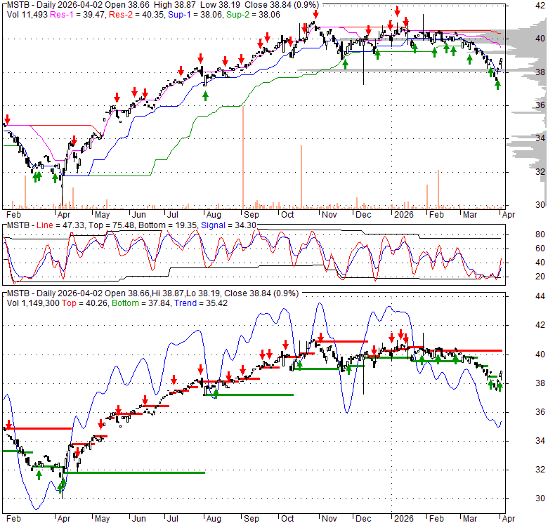 Price has closed above its short-term moving average. Short-term moving average is currently below mid-term; and below long-term moving average. From the relationship between price and moving averages: This stock is NEUTRAL in short-term; and BEARISH in mid-long term.[ MSTB ] has closed below upper band by 38.4%. Bollinger Bands are 49.8% wider than normal. The large width of the bands suggest high volatility as compared to its normal range. The bands have been in this wide range for 5 days. This is a sign that the current trend might continue.