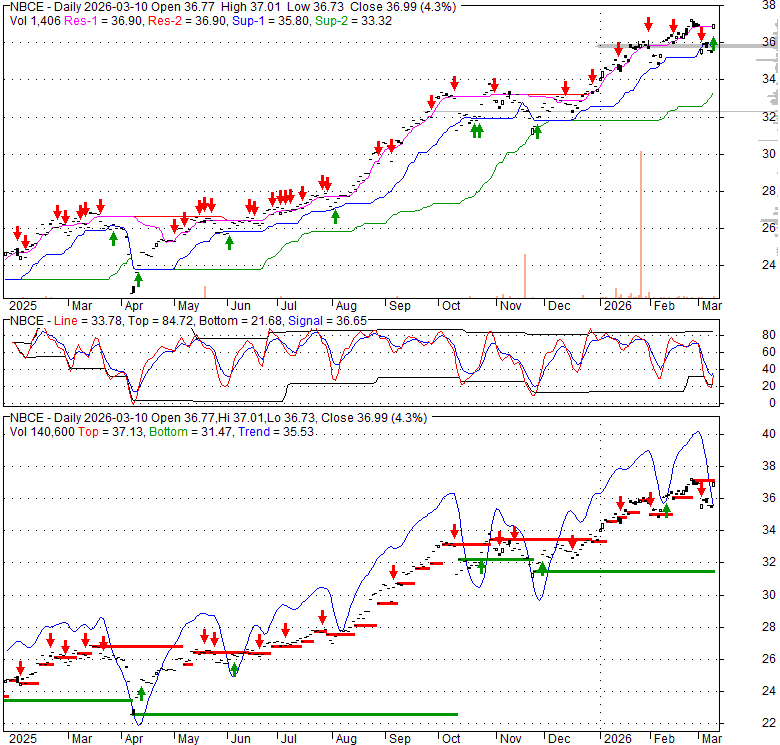 Price has closed above its short-term moving average. Short-term moving average is currently above mid-term; and above long-term moving average. From the relationship between price and moving averages: This stock is BULLISH in short-term; and BULLISH in mid-long term.[ NBCE ] has closed below upper band by 23.9%. Bollinger Bands are 11.3% wider than normal. The current width of the bands does not suggest anything about the future direction or movement of prices.