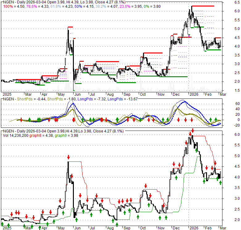 Price has closed above its short-term moving average. Short-term moving average is currently below mid-term; and above long-term moving average. From the relationship between price and moving averages: This stock is NEUTRAL in short-term; and NEUTRAL in mid-long term.[ NGEN ] has closed below upper band by 28.5%. Bollinger Bands are 63.6% narrower than normal. The narrow width of the bands suggests low volatility as compared to its normal range. The bands have been in this narrow range for 11 bars. This is a sign that the market may be about to initiate a new trend.