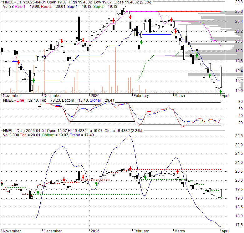 Price has closed above its short-term moving average. Short-term moving average is currently below mid-term; and below long-term moving average. From the relationship between price and moving averages: This stock is NEUTRAL in short-term; and NEUTRAL in mid-long term.[ NMBL ] has closed below upper band by 45.6%. Bollinger Bands are 0% narrower than normal.