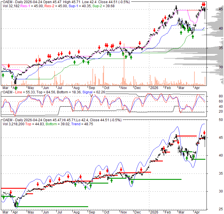 Price has closed below its short-term moving average. Short-term moving average is currently above mid-term; and above long-term moving average. From the relationship between price and moving averages: This stock is NEUTRAL in short-term; and BULLISH in mid-long term.[ OAEM ] has closed below upper band by 41.6%. Bollinger Bands are 33.7% wider than normal. The current width of the bands does not suggest anything about the future direction or movement of prices.