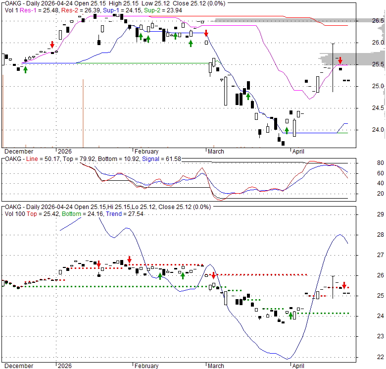 Price has closed below its short-term moving average. Short-term moving average is currently above mid-term; and below long-term moving average. From the relationship between price and moving averages: This stock is NEUTRAL in short-term; and NEUTRAL in mid-long term.[ OAKG ] has closed below upper band by 49.4%. Bollinger Bands are 0% narrower than normal.