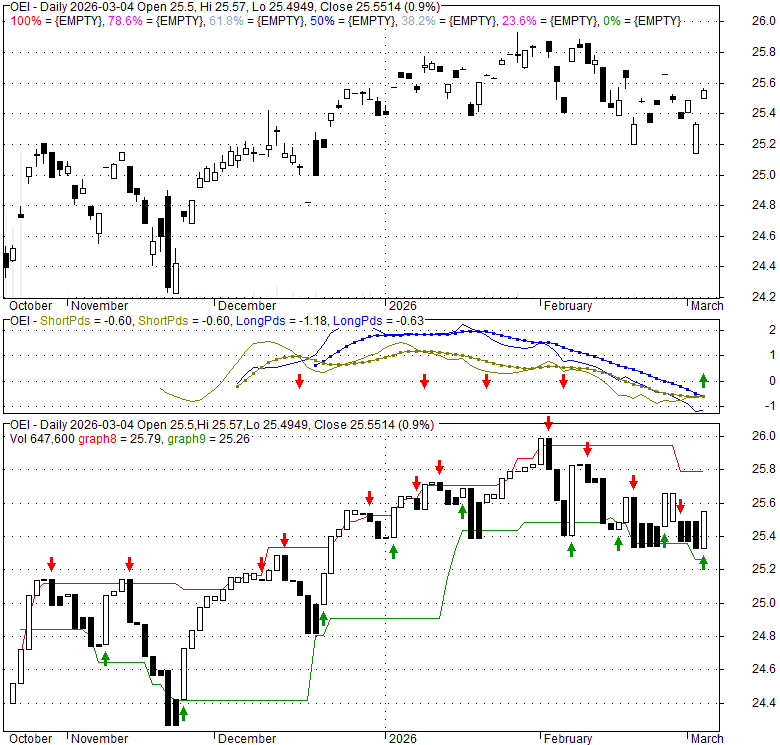 Price has closed above its short-term moving average. Short-term moving average is currently below mid-term; and below long-term moving average. From the relationship between price and moving averages: This stock is NEUTRAL in short-term; and NEUTRAL in mid-long term.[ OEI ] has closed below upper band by 36.3%. Bollinger Bands are 0% narrower than normal.