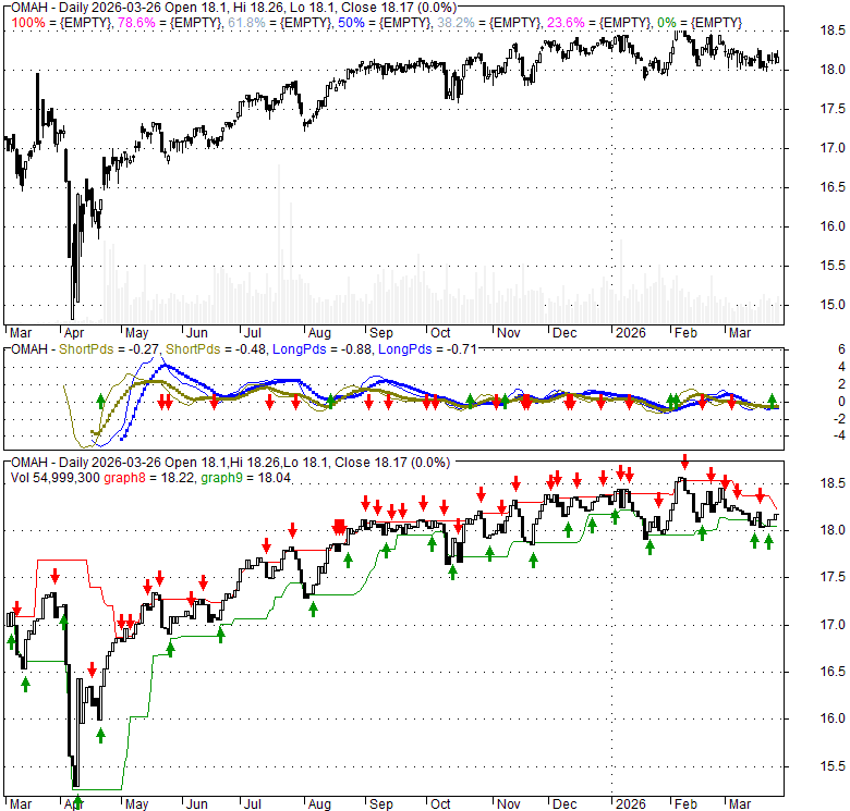 Price has closed above its short-term moving average. Short-term moving average is currently below mid-term; and below long-term moving average. From the relationship between price and moving averages: This stock is NEUTRAL in short-term; and NEUTRAL in mid-long term.[ OMAH ] has closed below upper band by 34.6%. Bollinger Bands are 48.5% narrower than normal. The narrow width of the bands suggests low volatility as compared to its normal range. The bands have been in this narrow range for 2 bars. This is a sign that the market may be about to initiate a new trend.