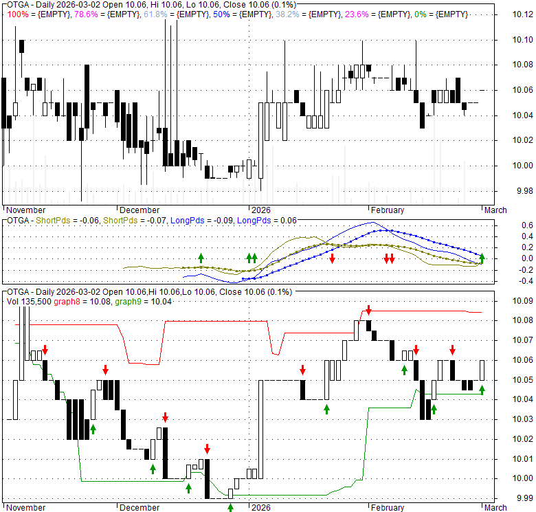 Price has closed above its short-term moving average. Short-term moving average is currently above mid-term; and below long-term moving average. From the relationship between price and moving averages: This stock is BULLISH in short-term; and NEUTRAL in mid-long term.[ OTGA ] has closed below upper band by 27.5%. Bollinger Bands are 0% narrower than normal.