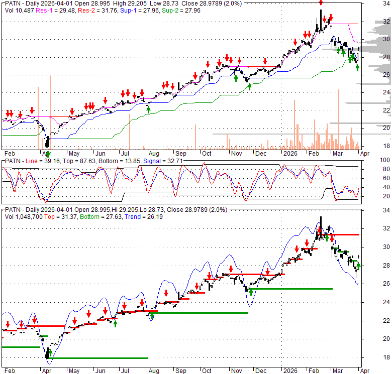 Price has closed above its short-term moving average. Short-term moving average is currently below mid-term; and below long-term moving average. From the relationship between price and moving averages: This stock is NEUTRAL in short-term; and NEUTRAL in mid-long term.[ PATN ] has closed below upper band by 38.3%. Bollinger Bands are 18.6% wider than normal. The current width of the bands does not suggest anything about the future direction or movement of prices.