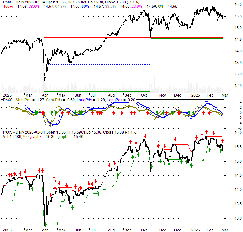 Price has closed below its short-term moving average. Short-term moving average is currently below mid-term; and above long-term moving average. From the relationship between price and moving averages: This stock is BEARISH in short-term; and NEUTRAL in mid-long term.[ PAXS ] has closed above bottom band by 3.2%. Bollinger Bands are 12.5% narrower than normal. The current width of the bands does not suggest anything about the future direction or movement of prices.