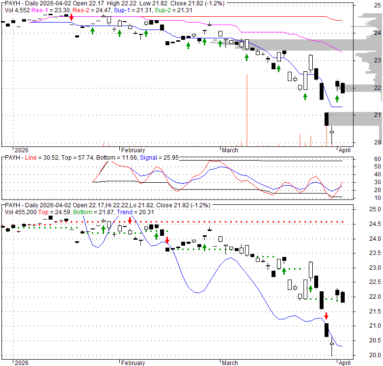 Price has closed above its short-term moving average. Short-term moving average is currently below mid-term; and below long-term moving average. From the relationship between price and moving averages: This stock is NEUTRAL in short-term; and NEUTRAL in mid-long term.[ PAYH ] has closed above bottom band by 36.8%. Bollinger Bands are 0% narrower than normal.