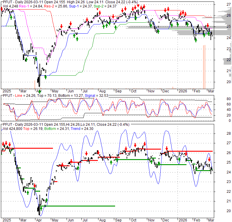 Price has closed below its short-term moving average. Short-term moving average is currently below mid-term; and below long-term moving average. From the relationship between price and moving averages: This stock is BEARISH in short-term; and BEARISH in mid-long term.[ PFUT ] has closed above bottom band by 17.9%. Bollinger Bands are 7.6% narrower than normal. The current width of the bands does not suggest anything about the future direction or movement of prices.