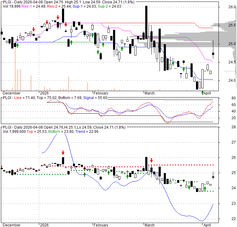 Price has closed above its short-term moving average. Short-term moving average is currently below mid-term; and below long-term moving average. From the relationship between price and moving averages: This stock is NEUTRAL in short-term; and NEUTRAL in mid-long term.[ PLGI ] has closed Bollinger Bands are 0% narrower than normal.