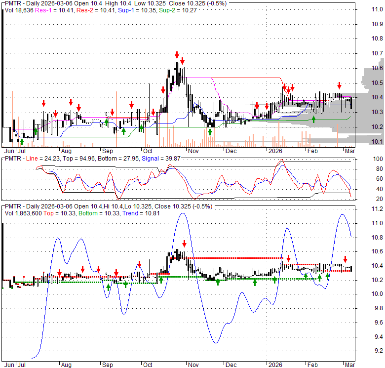 Price has closed below its short-term moving average. Short-term moving average is currently above mid-term; and above long-term moving average. From the relationship between price and moving averages: This stock is NEUTRAL in short-term; and BULLISH in mid-long term.[ PMTR ] has closed below the lower bollinger band by 11.3%. Although price has broken the lower band and a downside breakout is possible; the most likely direction for [ PMTR ] is to continue within current trading range. It is unclear right now based on current values. 42.9% narrower than normal. The narrow width of the bands suggests low volatility as compared to its normal range. The bands have been in this narrow range for 1 bars. This is a sign that the market may be about to initiate a new trend.