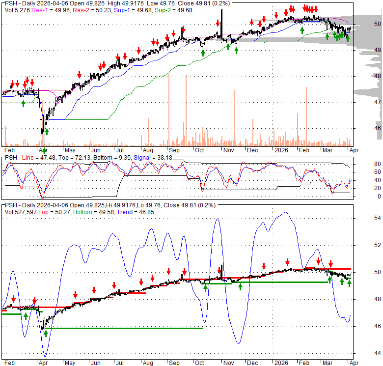 Price has closed above its short-term moving average. Short-term moving average is currently below mid-term; and below long-term moving average. From the relationship between price and moving averages: This stock is NEUTRAL in short-term; and NEUTRAL in mid-long term.[ PSH ] has closed below upper band by 15.6%. Bollinger Bands are 51.1% wider than normal. The large width of the bands suggest high volatility as compared to its normal range. The bands have been in this wide range for 16 days. This is a sign that the current trend might continue.