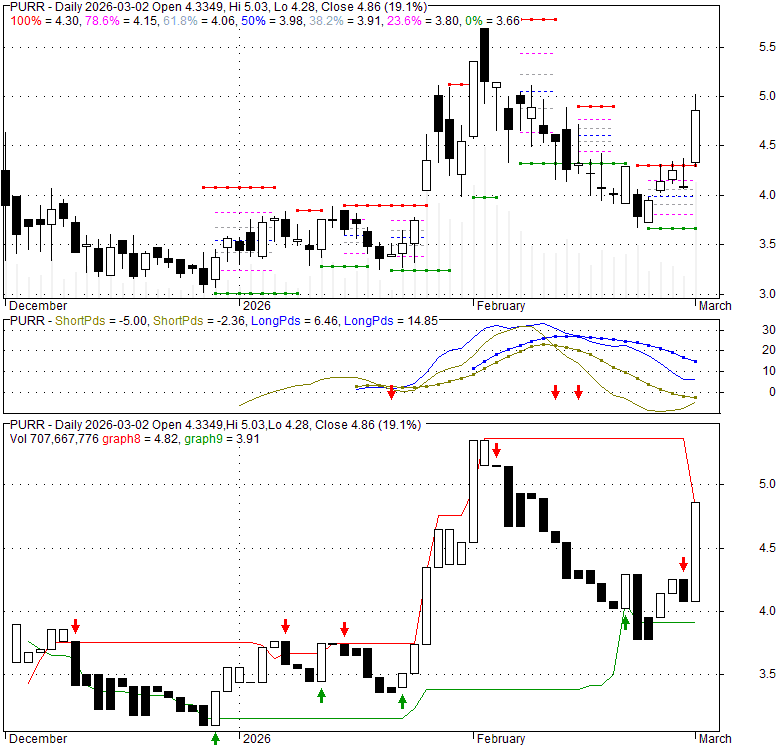 Price has closed above its short-term moving average. Short-term moving average is currently above mid-term; and below long-term moving average. From the relationship between price and moving averages: This stock is BULLISH in short-term; and NEUTRAL in mid-long term.[ PURR ] has closed below upper band by 3.6%. Bollinger Bands are 0% narrower than normal.