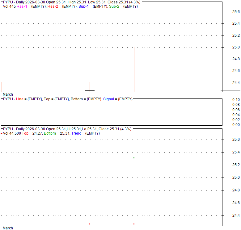 Price has closed below its short-term moving average. Short-term moving average is currently below mid-term; and below long-term moving average. From the relationship between price and moving averages: This stock is NEUTRAL in short-term; and NEUTRAL in mid-long term.[ PYPU ] has closed Bollinger Bands are 0% narrower than normal.