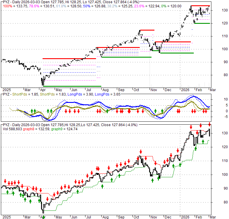 Price has closed below its short-term moving average. Short-term moving average is currently above mid-term; and above long-term moving average. From the relationship between price and moving averages: This stock is NEUTRAL in short-term; and BULLISH in mid-long term.[ PYZ ] has closed above bottom band by 23.5%. Bollinger Bands are 34.5% narrower than normal. The current width of the bands does not suggest anything about the future direction or movement of prices.