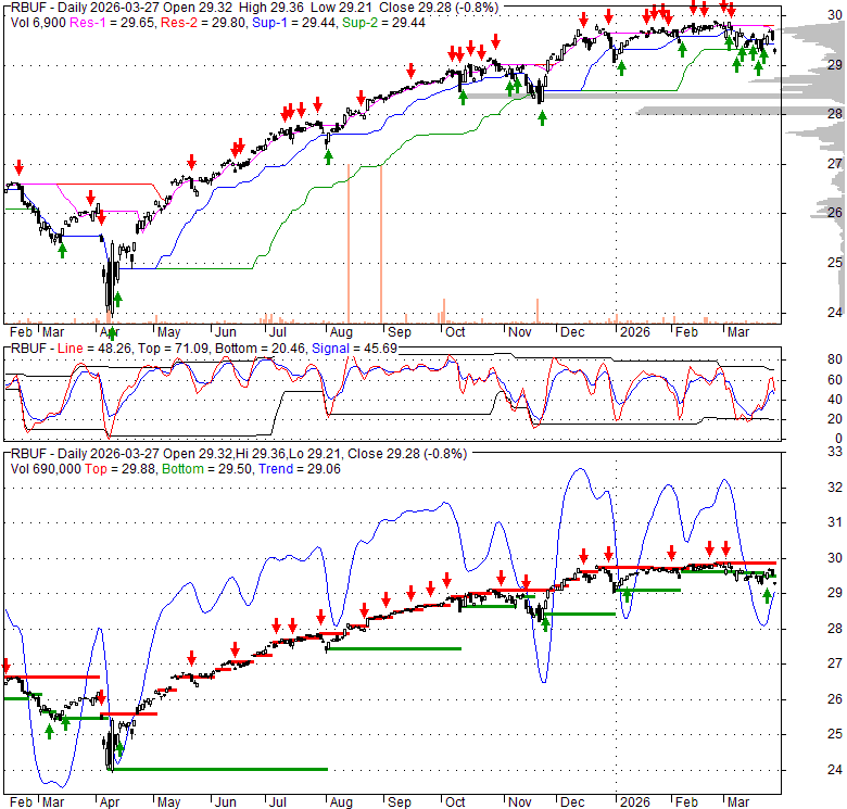 Price has closed below its short-term moving average. Short-term moving average is currently below mid-term; and above long-term moving average. From the relationship between price and moving averages: This stock is BEARISH in short-term; and NEUTRAL in mid-long term.[ RBUF ] has closed above bottom band by 1.0%. Bollinger Bands are 24% narrower than normal. The current width of the bands does not suggest anything about the future direction or movement of prices.