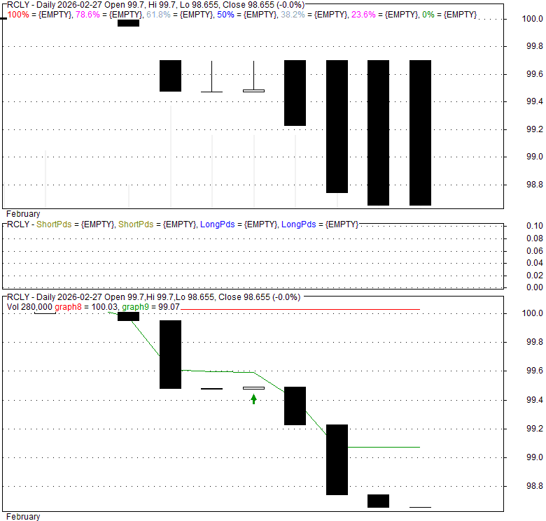 Price has closed below its short-term moving average. Short-term moving average is currently below mid-term; and below long-term moving average. From the relationship between price and moving averages: This stock is NEUTRAL in short-term; and NEUTRAL in mid-long term.[ RCLY ] has closed Bollinger Bands are 0% narrower than normal.