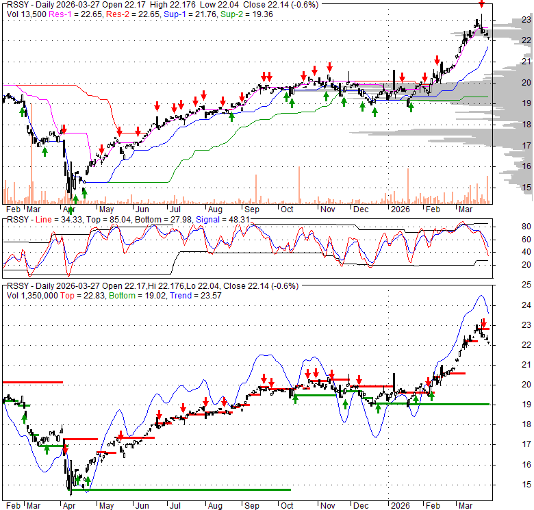 Price has closed below its short-term moving average. Short-term moving average is currently above mid-term; and above long-term moving average. From the relationship between price and moving averages: This stock is NEUTRAL in short-term; and BULLISH in mid-long term.[ RSSY ] has closed above bottom band by 26.3%. Bollinger Bands are 8% narrower than normal. The current width of the bands does not suggest anything about the future direction or movement of prices.