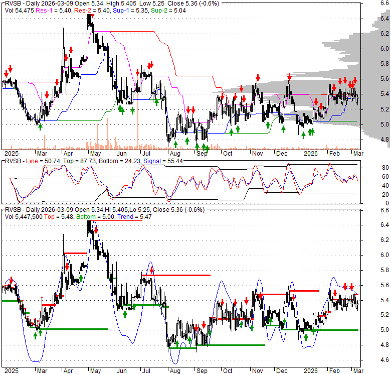 Price has closed below its short-term moving average. Short-term moving average is currently above mid-term; and above long-term moving average. From the relationship between price and moving averages: This stock is NEUTRAL in short-term; and BULLISH in mid-long term.[ RVSB ] has closed above bottom band by 41.4%. Bollinger Bands are 60.6% narrower than normal. The narrow width of the bands suggests low volatility as compared to its normal range. The bands have been in this narrow range for 10 bars. This is a sign that the market may be about to initiate a new trend.