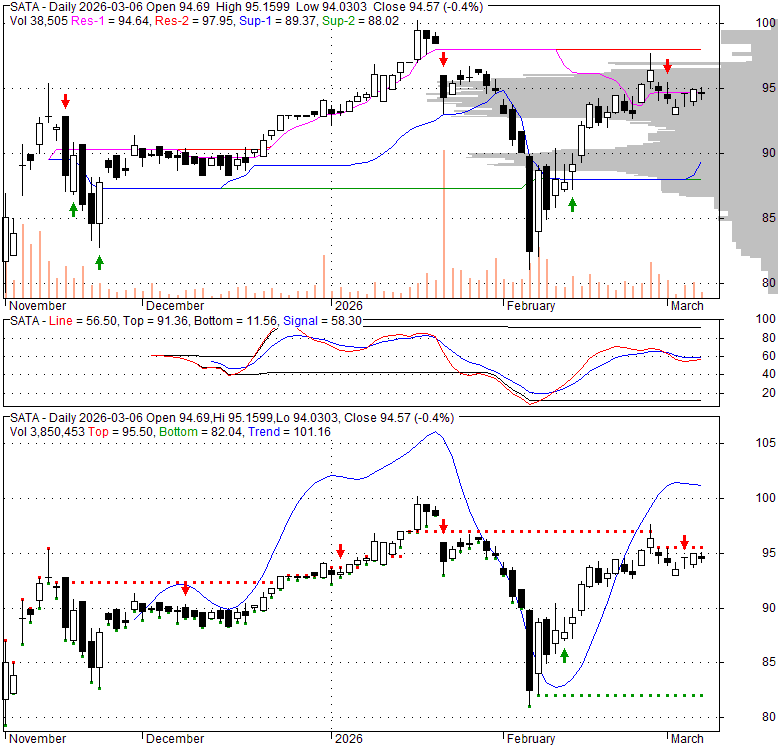 Price has closed above its short-term moving average. Short-term moving average is currently above mid-term; and below long-term moving average. From the relationship between price and moving averages: This stock is BULLISH in short-term; and NEUTRAL in mid-long term.[ SATA ] has closed below upper band by 37.8%. Bollinger Bands are 0% narrower than normal.
