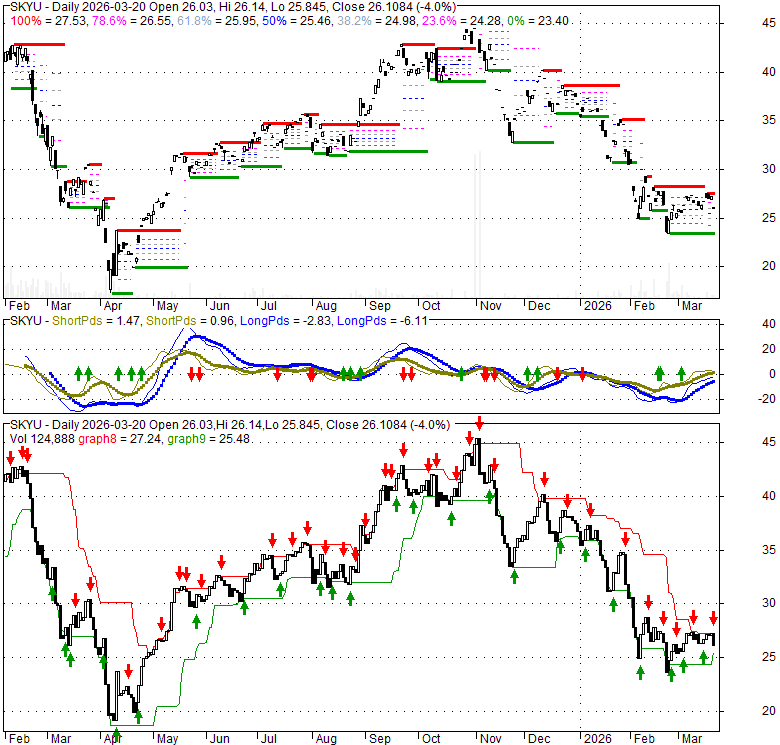 Price has closed below its short-term moving average. Short-term moving average is currently below mid-term; and below long-term moving average. From the relationship between price and moving averages: This stock is BEARISH in short-term; and BEARISH in mid-long term.[ SKYU ] has closed above bottom band by 24.8%. Bollinger Bands are 68% narrower than normal. The narrow width of the bands suggests low volatility as compared to its normal range. The bands have been in this narrow range for 6 bars. This is a sign that the market may be about to initiate a new trend.