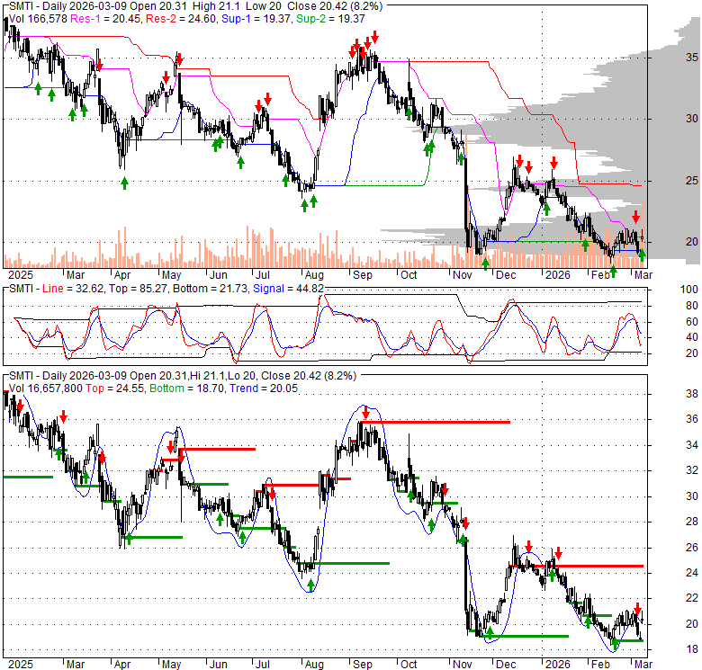Price has closed above its short-term moving average. Short-term moving average is currently below mid-term; and below long-term moving average. From the relationship between price and moving averages: This stock is NEUTRAL in short-term; and BEARISH in mid-long term.[ SMTI ] has closed below upper band by 40.8%. Bollinger Bands are 53.9% narrower than normal. The narrow width of the bands suggests low volatility as compared to its normal range. The bands have been in this narrow range for 11 bars. This is a sign that the market may be about to initiate a new trend.