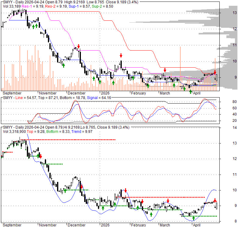 Price has closed above its short-term moving average. Short-term moving average is currently above mid-term; and below long-term moving average. From the relationship between price and moving averages: This stock is BULLISH in short-term; and NEUTRAL in mid-long term.[ SMYY ] has closed below upper band by 29.5%. Bollinger Bands are 12% narrower than normal. The current width of the bands does not suggest anything about the future direction or movement of prices.