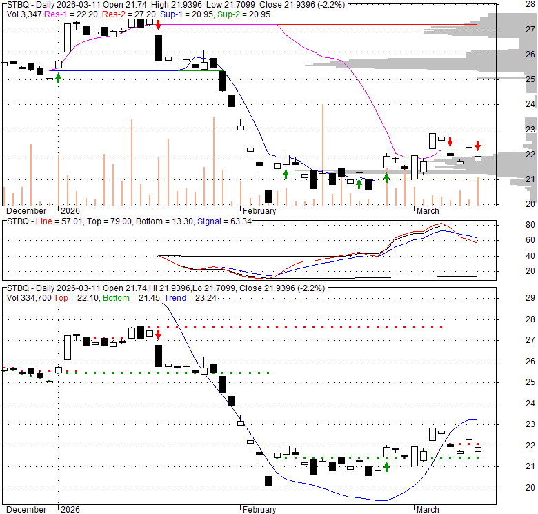 Price has closed below its short-term moving average. Short-term moving average is currently below mid-term; and below long-term moving average. From the relationship between price and moving averages: This stock is BEARISH in short-term; and NEUTRAL in mid-long term.[ STBQ ] has closed above bottom band by 26.2%. Bollinger Bands are 0% narrower than normal.