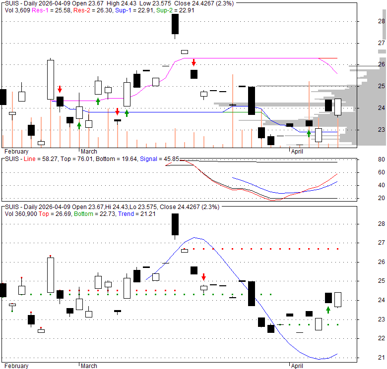 Price has closed above its short-term moving average. Short-term moving average is currently below mid-term; and below long-term moving average. From the relationship between price and moving averages: This stock is NEUTRAL in short-term; and NEUTRAL in mid-long term.[ SUIS ] has closed below upper band by 29.1%. Bollinger Bands are 0% narrower than normal.