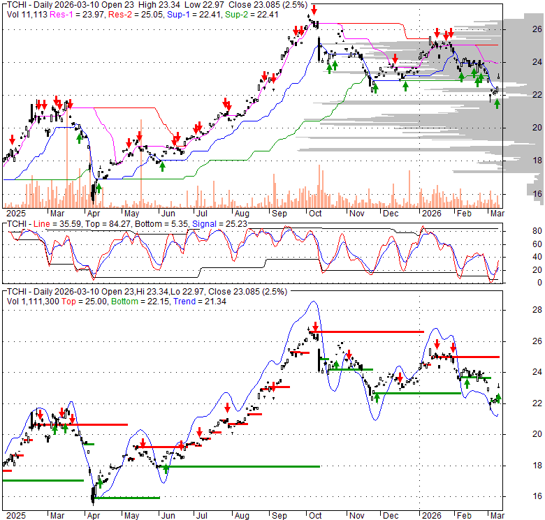 Price has closed above its short-term moving average. Short-term moving average is currently below mid-term; and below long-term moving average. From the relationship between price and moving averages: This stock is NEUTRAL in short-term; and NEUTRAL in mid-long term.[ TCHI ] has closed above bottom band by 47.0%. Bollinger Bands are 39.9% wider than normal. The current width of the bands does not suggest anything about the future direction or movement of prices.
