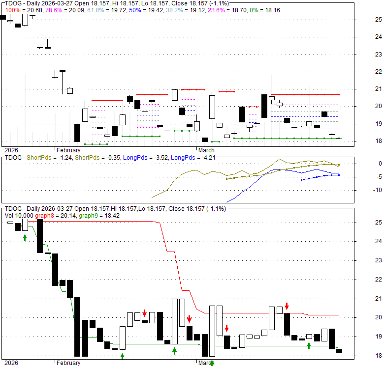 Price has closed below its short-term moving average. Short-term moving average is currently below mid-term; and below long-term moving average. From the relationship between price and moving averages: This stock is BEARISH in short-term; and NEUTRAL in mid-long term.[ TDOG ] has closed above bottom band by 12.3%. Bollinger Bands are 0% narrower than normal.