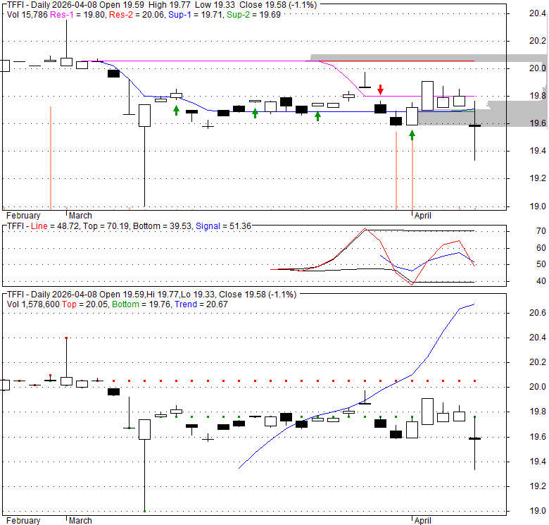 Price has closed below its short-term moving average. Short-term moving average is currently below mid-term; and below long-term moving average. From the relationship between price and moving averages: This stock is NEUTRAL in short-term; and NEUTRAL in mid-long term.[ TFFI ] has closed above bottom band by 2.2%. Bollinger Bands are 0% narrower than normal.
