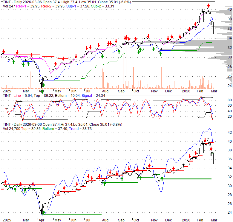 Price has closed below its short-term moving average. Short-term moving average is currently above mid-term; and above long-term moving average. From the relationship between price and moving averages: This stock is NEUTRAL in short-term; and BULLISH in mid-long term.[ TINT ] has closed below the lower bollinger band by 20.2%. Although price has broken the lower band and a downside breakout is possible; the most likely direction for [ TINT ] is to continue within current trading range. It is unclear right now based on current values. 113.9% wider than normal. The large width of the bands suggest high volatility as compared to its normal range. The bands have been in this wide range for 1 days. This is a sign that the current trend might continue.