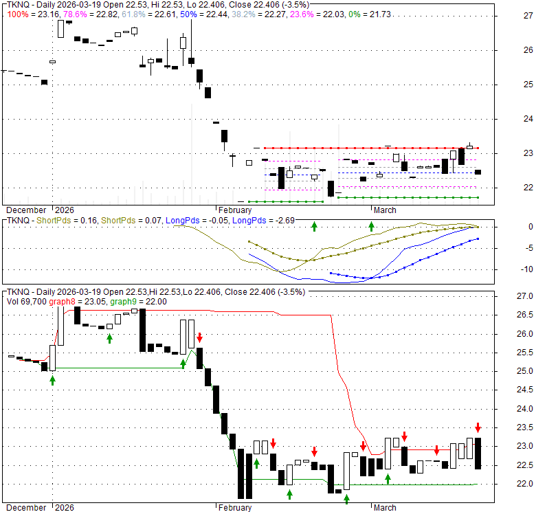 Price has closed below its short-term moving average. Short-term moving average is currently below mid-term; and below long-term moving average. From the relationship between price and moving averages: This stock is BEARISH in short-term; and NEUTRAL in mid-long term.[ TKNQ ] has closed above bottom band by 29.4%. Bollinger Bands are 0% narrower than normal.