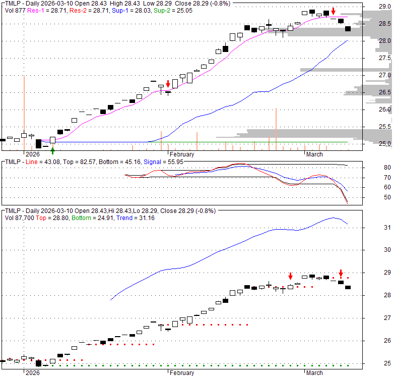 Price has closed below its short-term moving average. Short-term moving average is currently above mid-term; and below long-term moving average. From the relationship between price and moving averages: This stock is NEUTRAL in short-term; and NEUTRAL in mid-long term.[ TMLP ] has closed above bottom band by 21.5%. Bollinger Bands are 0% narrower than normal.