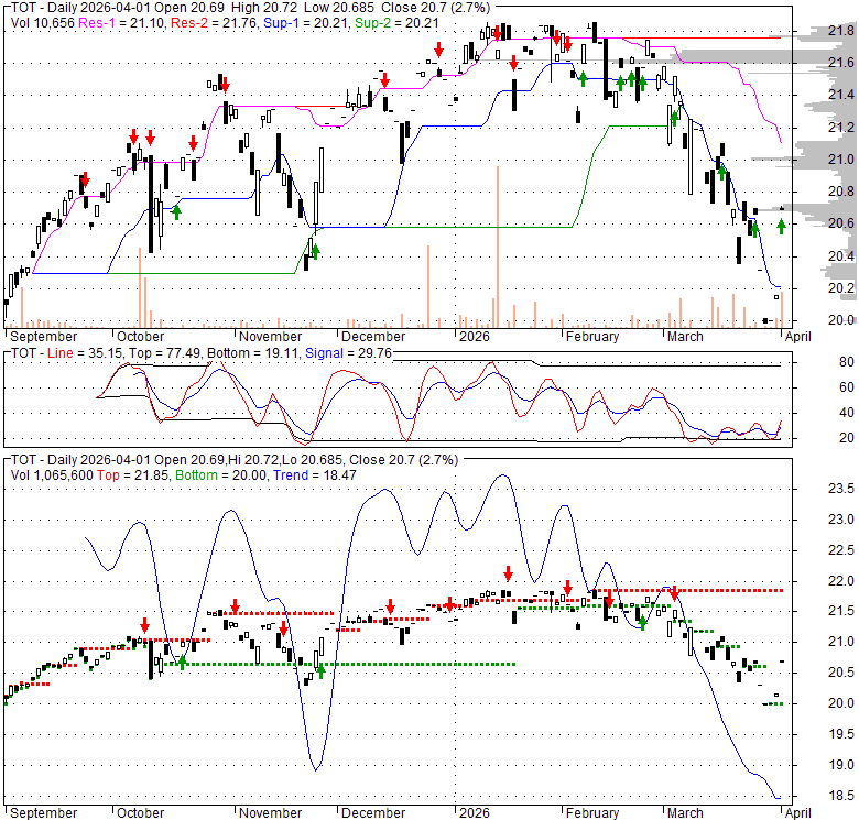 Price has closed above its short-term moving average. Short-term moving average is currently below mid-term; and below long-term moving average. From the relationship between price and moving averages: This stock is NEUTRAL in short-term; and BEARISH in mid-long term.[ TOT ] has closed below upper band by 38.3%. Bollinger Bands are 48.5% wider than normal. The large width of the bands suggest high volatility as compared to its normal range. The bands have been in this wide range for 3 days. This is a sign that the current trend might continue.