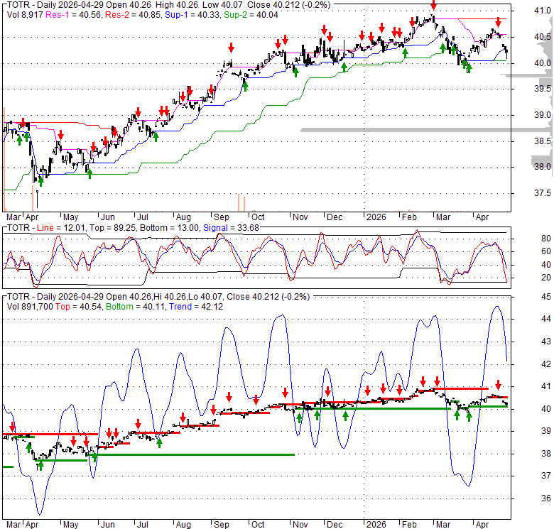 Price has closed below its short-term moving average. Short-term moving average is currently below mid-term; and above long-term moving average. From the relationship between price and moving averages: This stock is BEARISH in short-term; and NEUTRAL in mid-long term.[ TOTR ] has closed below the lower bollinger band by 5.4%. Bollinger Bands are 13.8% narrower than normal. The current width of the bands does not suggest anything about the future direction or movement of prices.