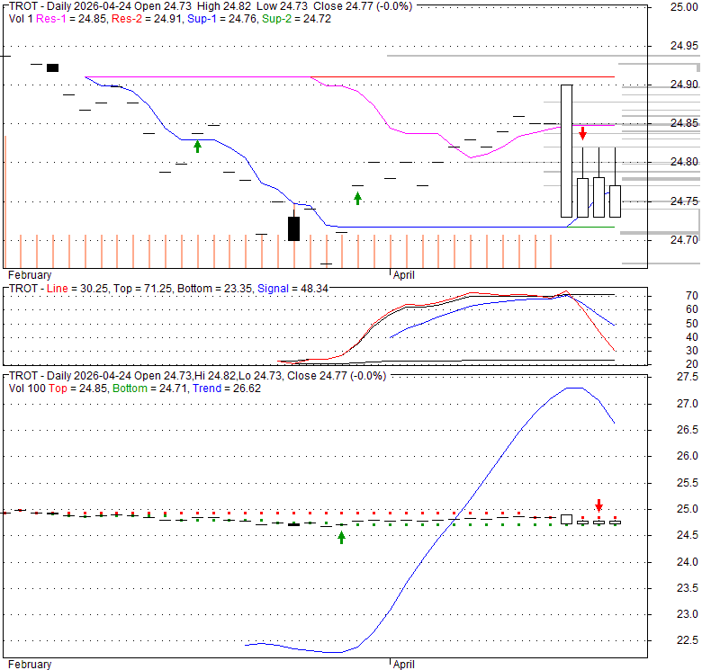 Price has closed below its short-term moving average. Short-term moving average is currently below mid-term; and below long-term moving average. From the relationship between price and moving averages: This stock is NEUTRAL in short-term; and NEUTRAL in mid-long term.[ TROT ] has closed above bottom band by 23.3%. Bollinger Bands are 0% narrower than normal.