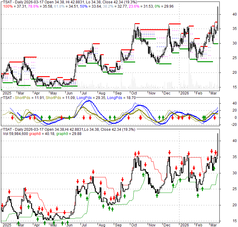 Price has closed above its short-term moving average. Short-term moving average is currently above mid-term; and above long-term moving average. From the relationship between price and moving averages: This stock is BULLISH in short-term; and BULLISH in mid-long term.[ TSAT ] has closed above the upper band by 30.2%. If price is in a uptrend band; this upward trend in price might continue. However a short term pullback inside the band is likely.Bollinger Bands are 29.1% wider than normal. The current width of the bands does not suggest anything about the future direction or movement of prices.