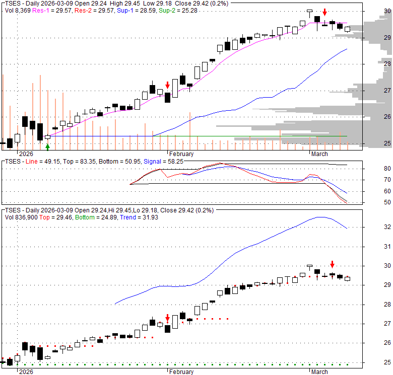 Price has closed below its short-term moving average. Short-term moving average is currently above mid-term; and below long-term moving average. From the relationship between price and moving averages: This stock is NEUTRAL in short-term; and NEUTRAL in mid-long term.[ TSES ] has closed below upper band by 42.8%. Bollinger Bands are 0% narrower than normal.