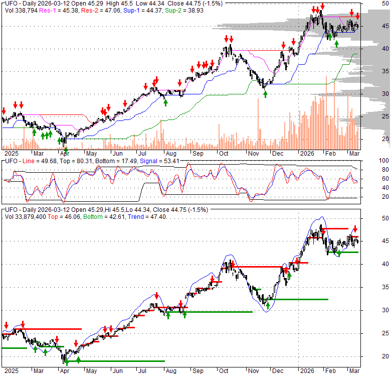 Price has closed below its short-term moving average. Short-term moving average is currently above mid-term; and above long-term moving average. From the relationship between price and moving averages: This stock is NEUTRAL in short-term; and BULLISH in mid-long term.[ UFO ] has closed above bottom band by 38.3%. Bollinger Bands are 57.4% narrower than normal. The narrow width of the bands suggests low volatility as compared to its normal range. The bands have been in this narrow range for 4 bars. This is a sign that the market may be about to initiate a new trend.