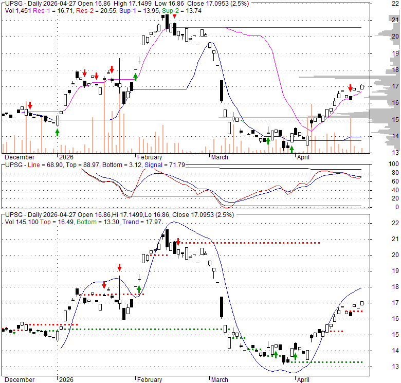 Price has closed below its short-term moving average. Short-term moving average is currently above mid-term; and below long-term moving average. From the relationship between price and moving averages: This stock is NEUTRAL in short-term; and NEUTRAL in mid-long term.[ UPSG ] has closed above bottom band by 24.2%. Bollinger Bands are 0% narrower than normal.