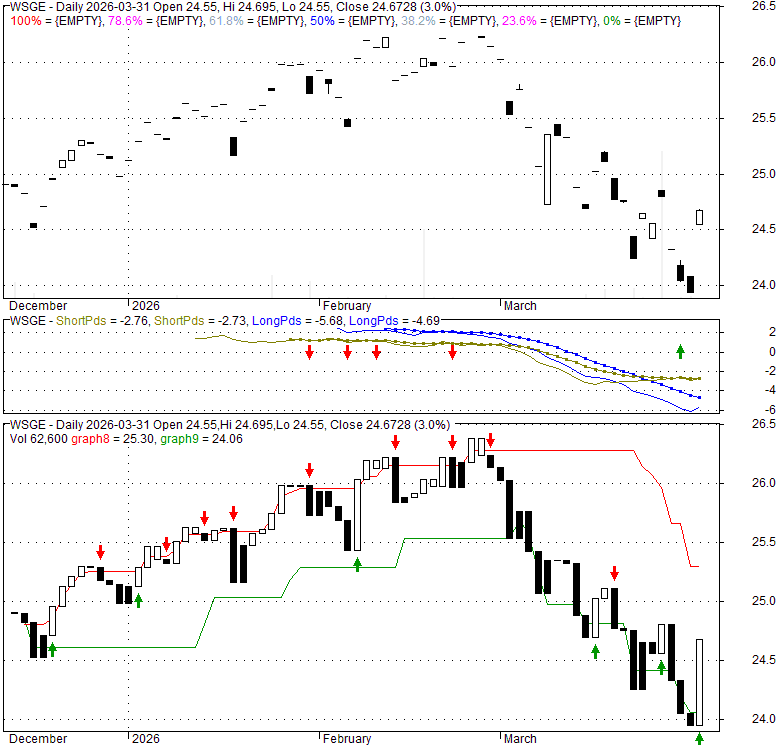 Price has closed above its short-term moving average. Short-term moving average is currently below mid-term; and below long-term moving average. From the relationship between price and moving averages: This stock is NEUTRAL in short-term; and NEUTRAL in mid-long term.[ WSGE ] has closed below upper band by 48.7%. Bollinger Bands are 0% narrower than normal.