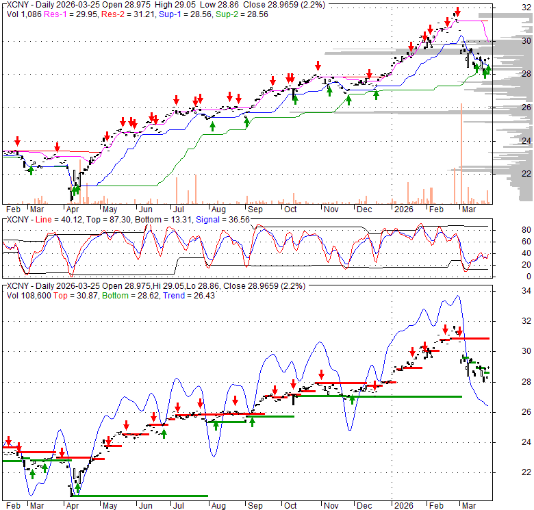 Price has closed above its short-term moving average. Short-term moving average is currently below mid-term; and below long-term moving average. From the relationship between price and moving averages: This stock is NEUTRAL in short-term; and NEUTRAL in mid-long term.[ XCNY ] has closed below upper band by 45.4%. Bollinger Bands are 3.6% wider than normal. The current width of the bands does not suggest anything about the future direction or movement of prices.