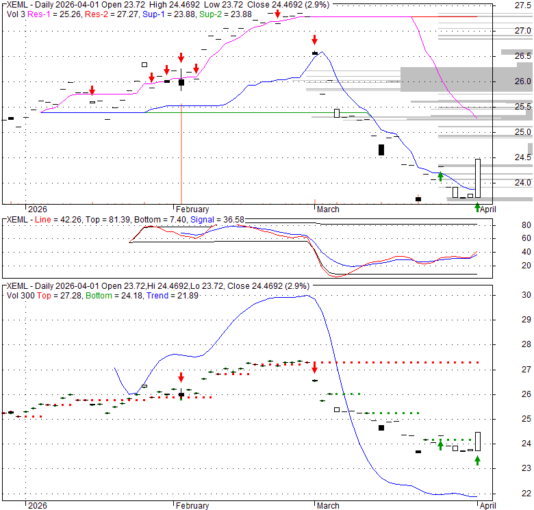 Price has closed above its short-term moving average. Short-term moving average is currently below mid-term; and below long-term moving average. From the relationship between price and moving averages: This stock is NEUTRAL in short-term; and NEUTRAL in mid-long term.[ XEML ] has closed below upper band by 38.0%. Bollinger Bands are 0% narrower than normal.